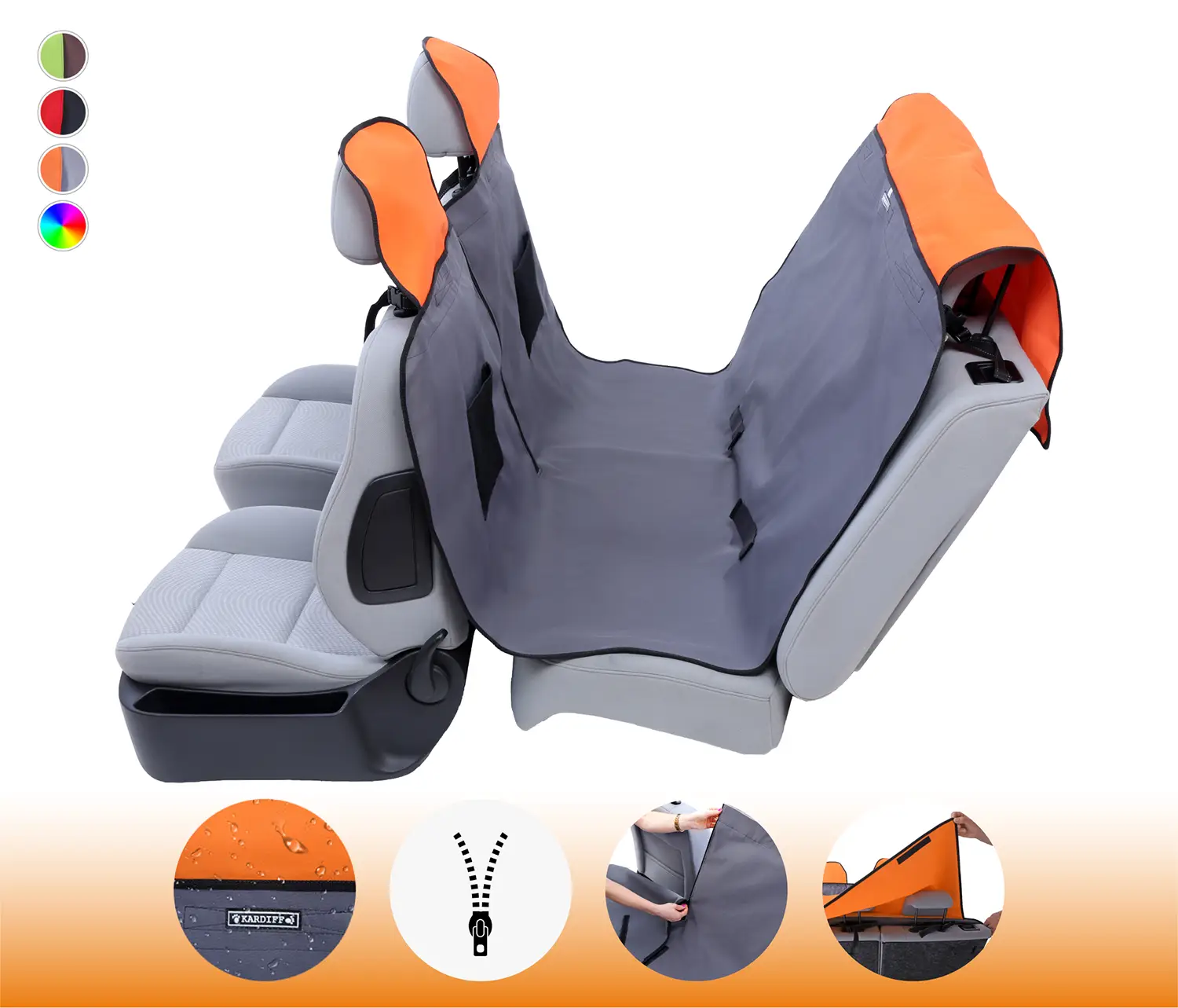 Kardimata Activ – wersja z zamkiem – nieprzemakalny pokrowiec z OCHRONNYMI NAKŁADKAMI NA ZAGŁÓWKI oraz KIESZENIAMI na akcesoria. Wersja z zamkiem umożliwia jednoczesne przewożenie psa wraz z pasażerem ( wystarczy rozpiąć zamek z jednego zagłówka i odpiąć klamrę z zagłówka). Kardimata przeznaczona jest w szczególności dla psów dużych ras które zajmują całą tylną kanapę lub dla kilku psów mniejszych ras.
